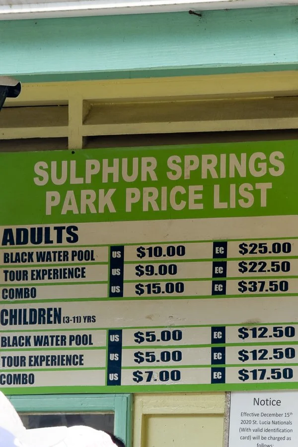 Admission to the St Lucia Mud Baths starts at $10.00 USD for adults and $5.00 for children. They offer a tour experience too for $9.00 or $15.00 for both.